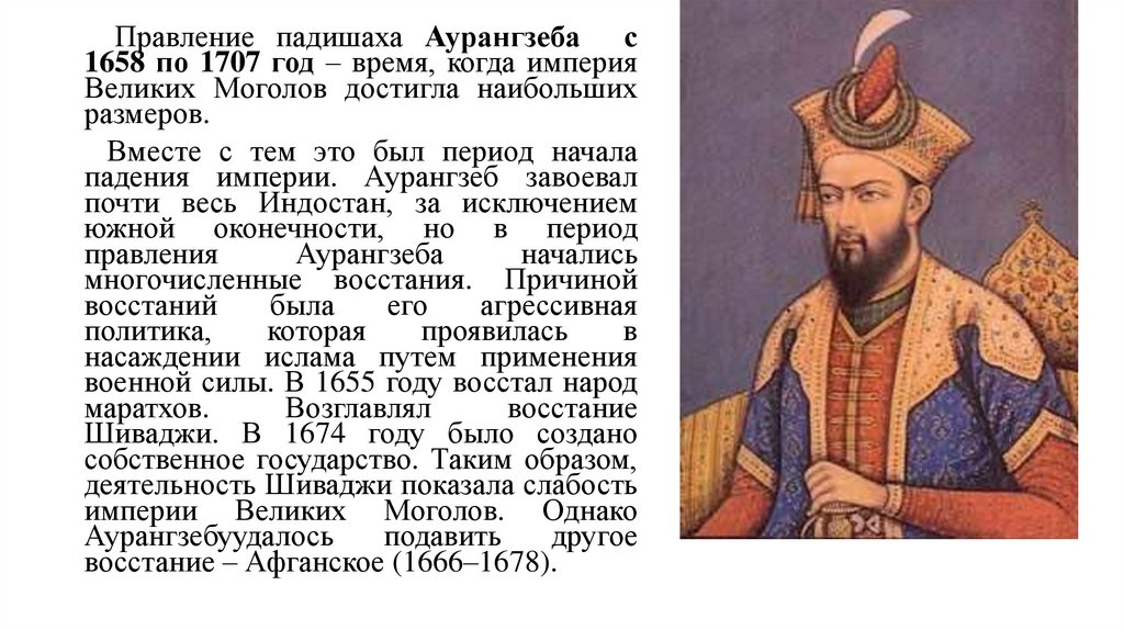 Правление падишаха Аурангзеба с1658 по 1707 год – время, когда империя