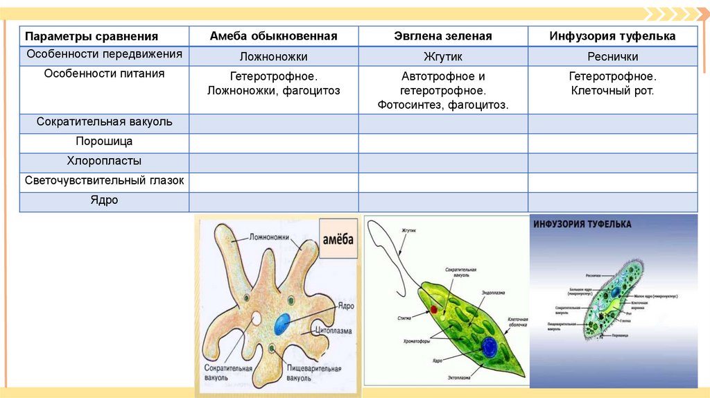 • Все три организма являются животными, так как питаются гетеротрофно (эвгленаспособна так же питаться автотрофно), активно передвигаются, вокруг клетки