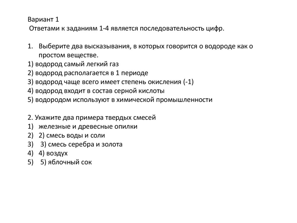 1. Выберите два высказывания, в которых говорится о водороде как о