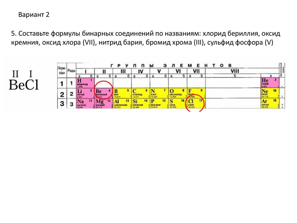 Вариант 25. Составьте формулы бинарных соединений по названиям: хлорид бериллия, оксид