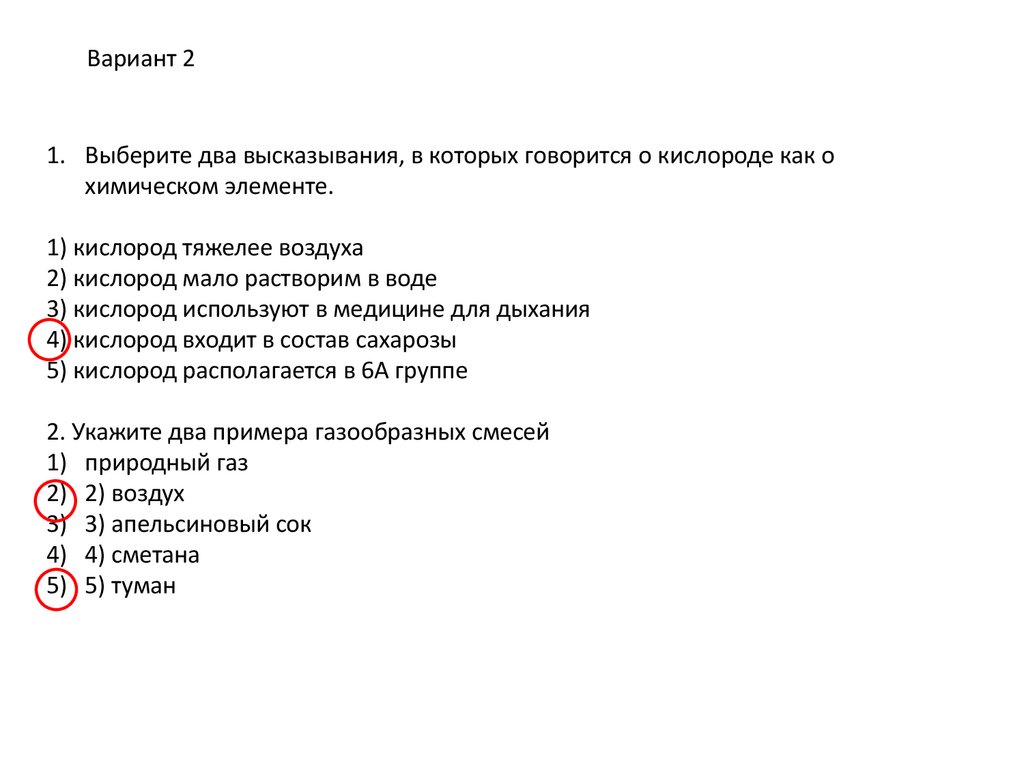 Вариант 21. Выберите два высказывания, в которых говорится о кислороде как о