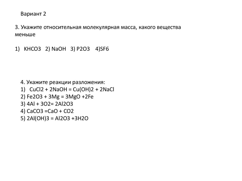 4. Укажите реакции разложения: