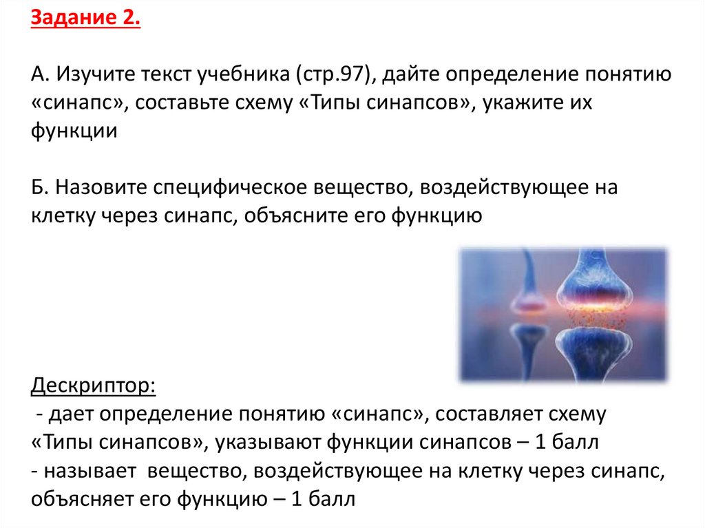 «Типы синапсов», указывают функции синапсов – 1 балл