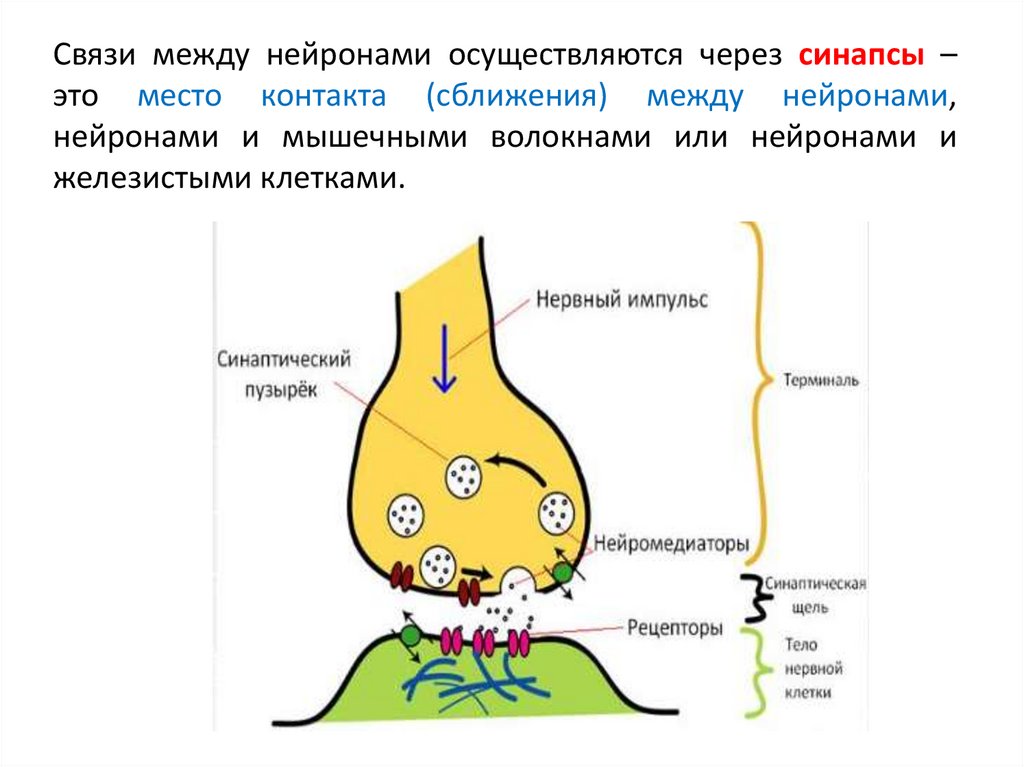 Связи между нейронами осуществляются через синапсы –это место контакта (сближения) между нейронами,