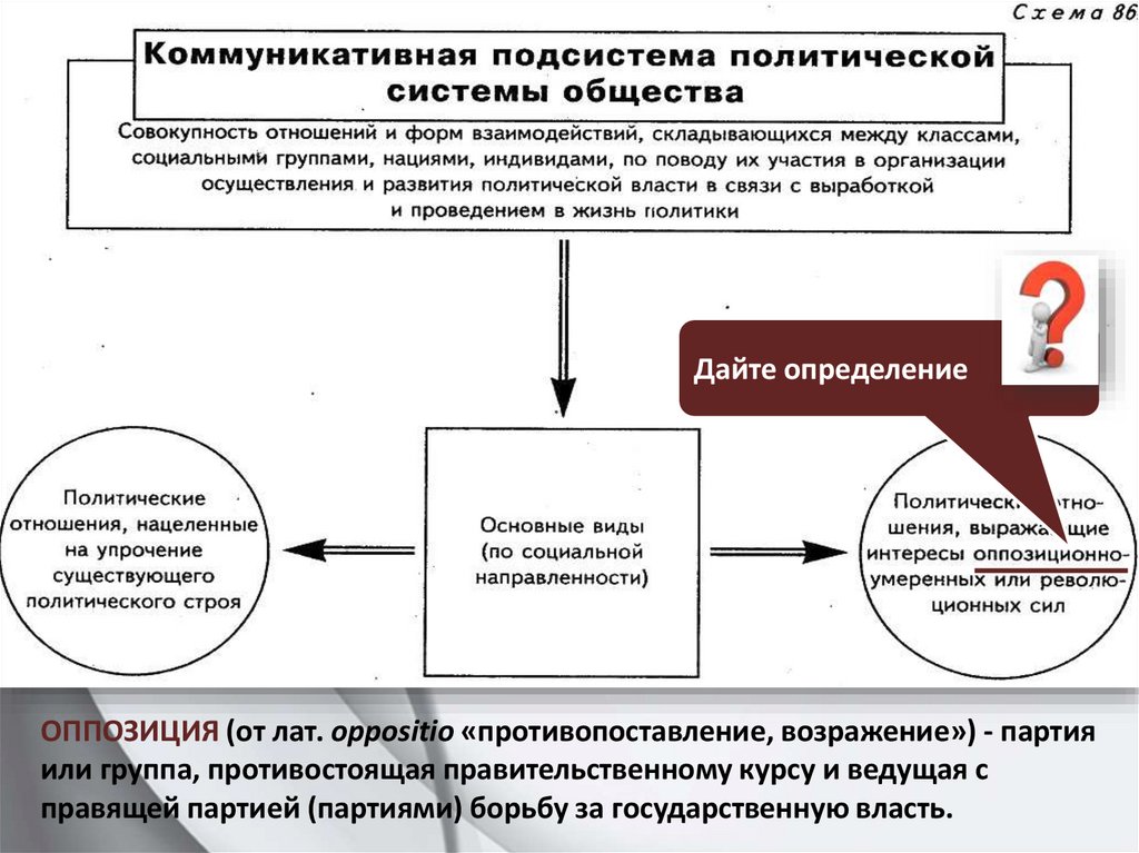 Дайте определениеОППОЗИЦИЯ (от лат. oppositio «противопоставление, возражение») - партия