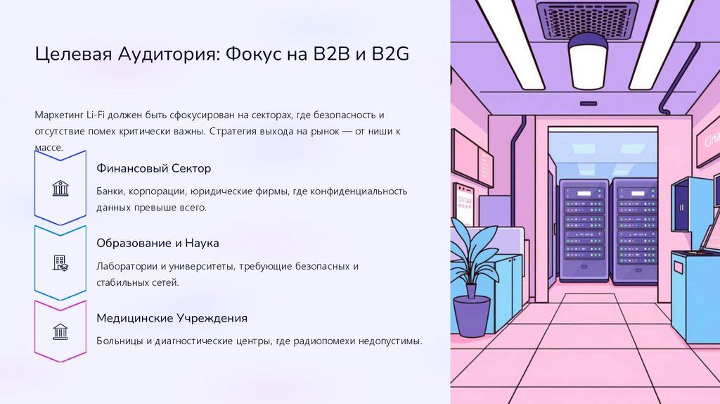 Целевая Аудитория: Фокус на B2B и B2GМаркетинг Li-Fi должен быть сфокусирован на секторах, где безопасность и