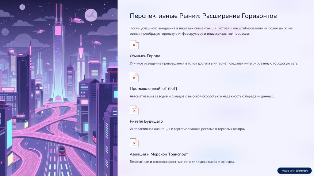 Перспективные Рынки: Расширение ГоризонтовПосле успешного внедрения в нишевых сегментах Li-F i готова к масштабированию на более широкие
