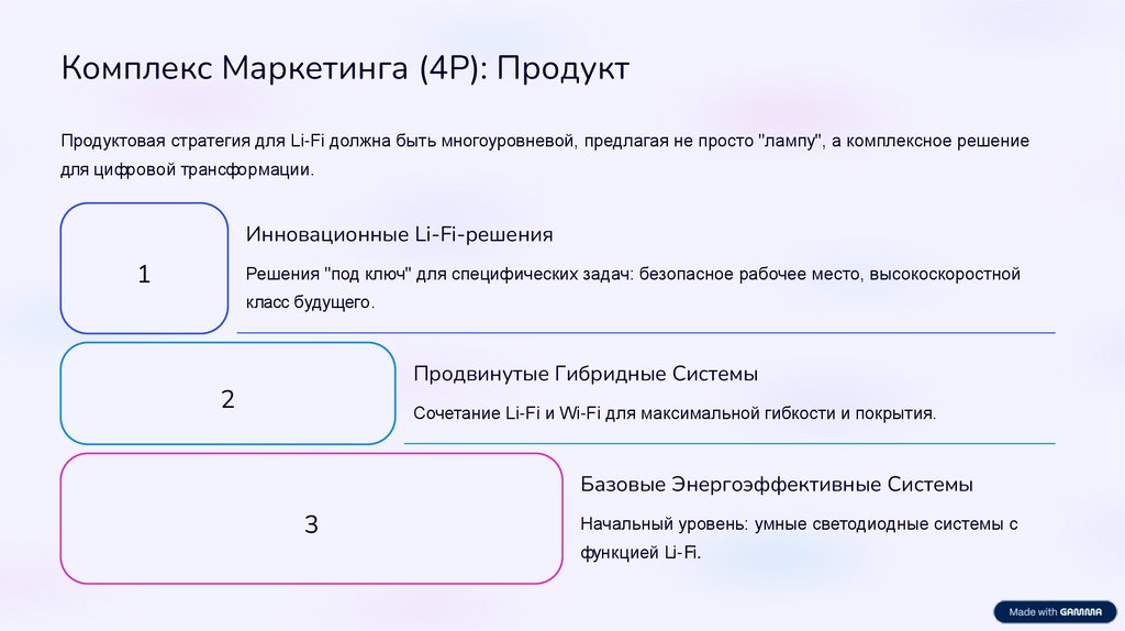 Комплекс Маркетинга (4P): ПродуктПродуктовая стратегия для Li-Fi должна быть многоуровневой, предлагая не просто "лампу", а комплексное решение