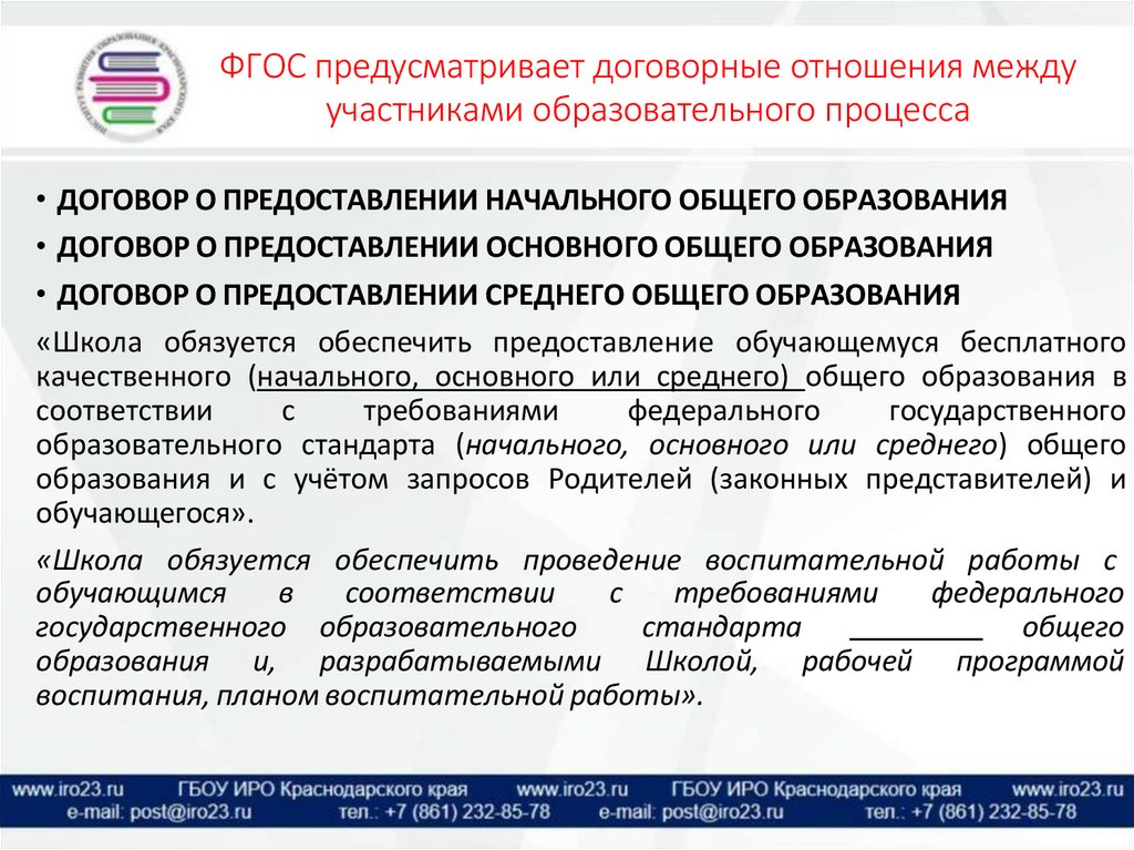 ФГОС предусматривает договорные отношения междуучастниками образовательного процесса