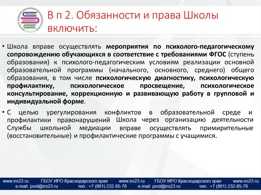 • Школа вправе осуществлять мероприятия по психолого-педагогическому