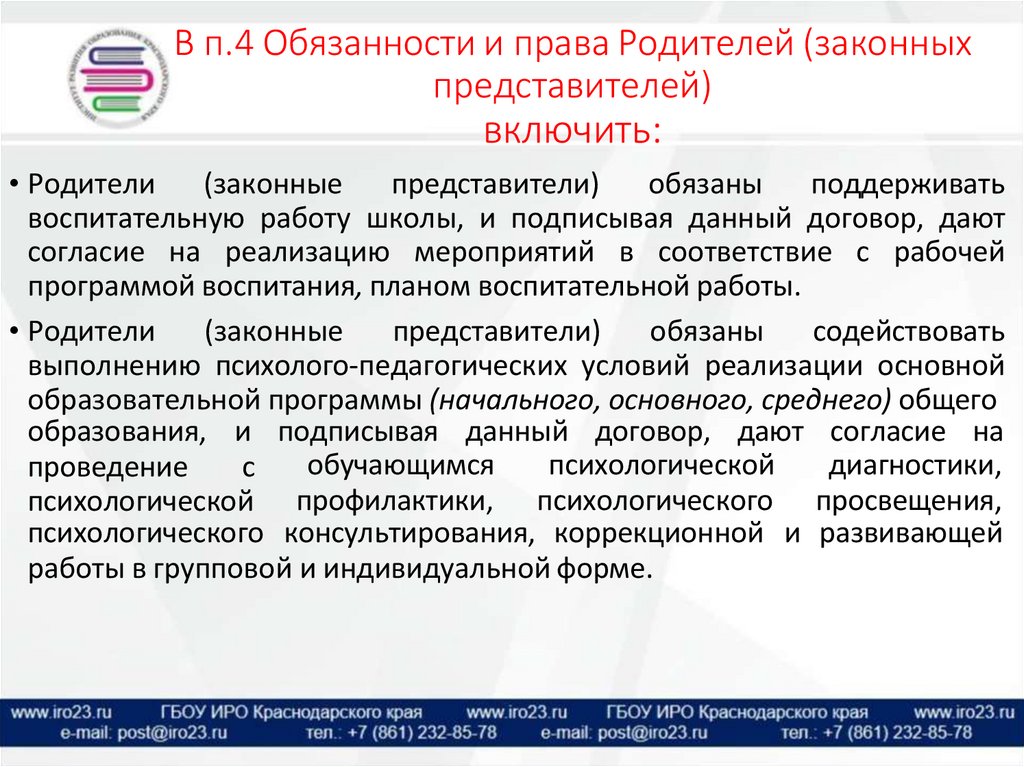 В п.4 Обязанности и права Родителей (законныхпредставителей)