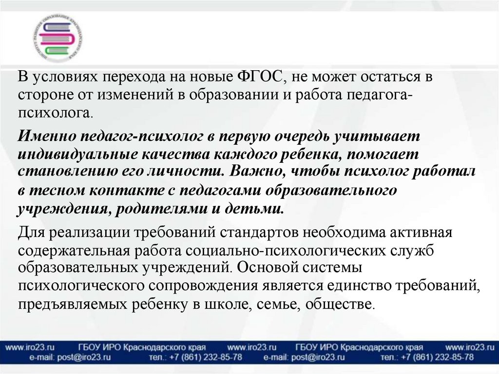 В условиях перехода на новые ФГОС, не может остаться встороне от изменений в образовании и работа педагогапсихолога.