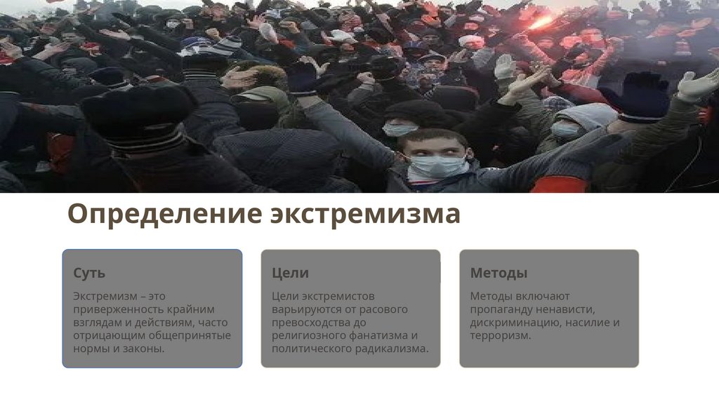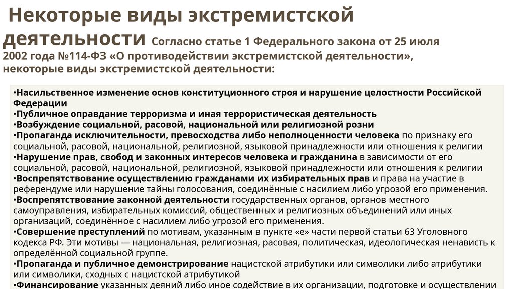 Некоторые виды экстремистскойдеятельности Согласно статье 1 Федерального закона от 25 июля