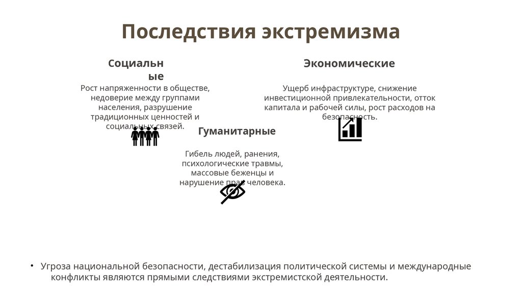 • Угроза национальной безопасности, дестабилизация политической системы и международные