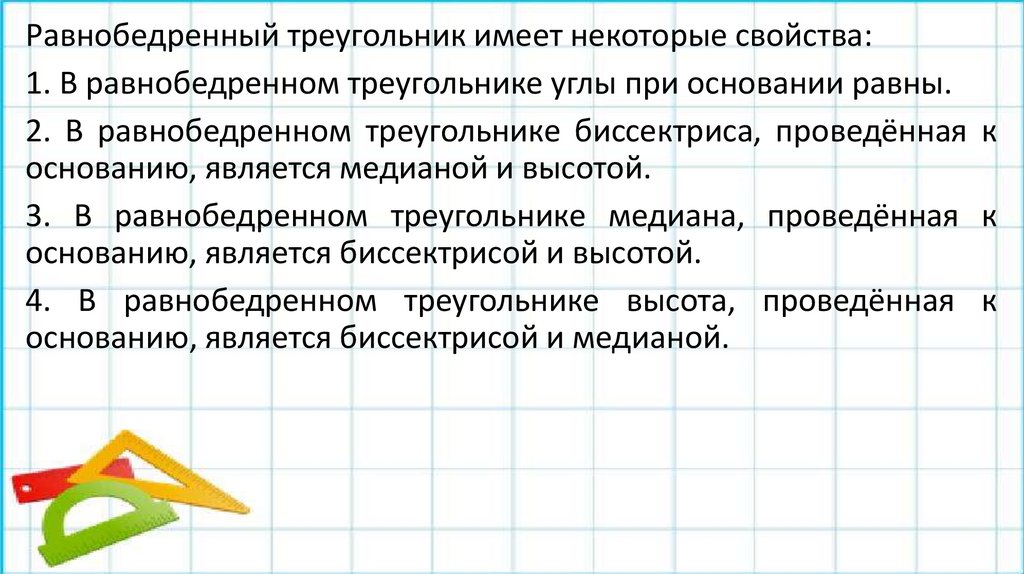 Равнобедренный треугольник имеет некоторые свойства:1. В равнобедренном треугольнике углы при основании равны.