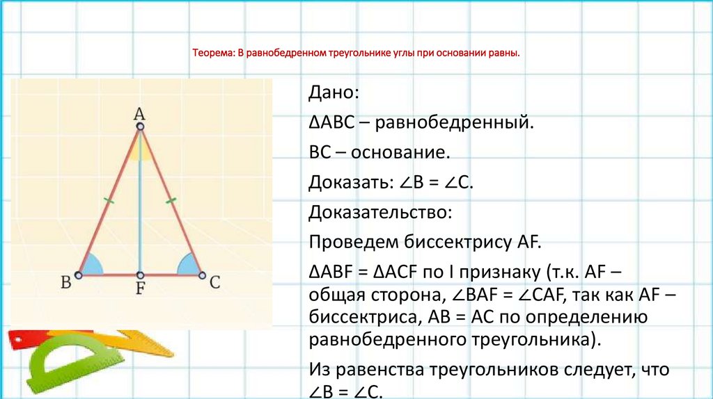 Теорема: В равнобедренном треугольнике углы при основании равны.Дано: