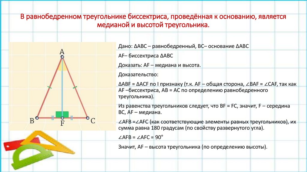 В равнобедренном треугольнике биссектриса, проведённая к основанию, являетсямедианой и высотой треугольника.