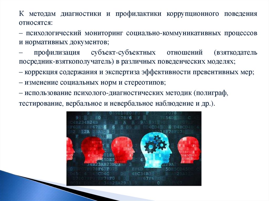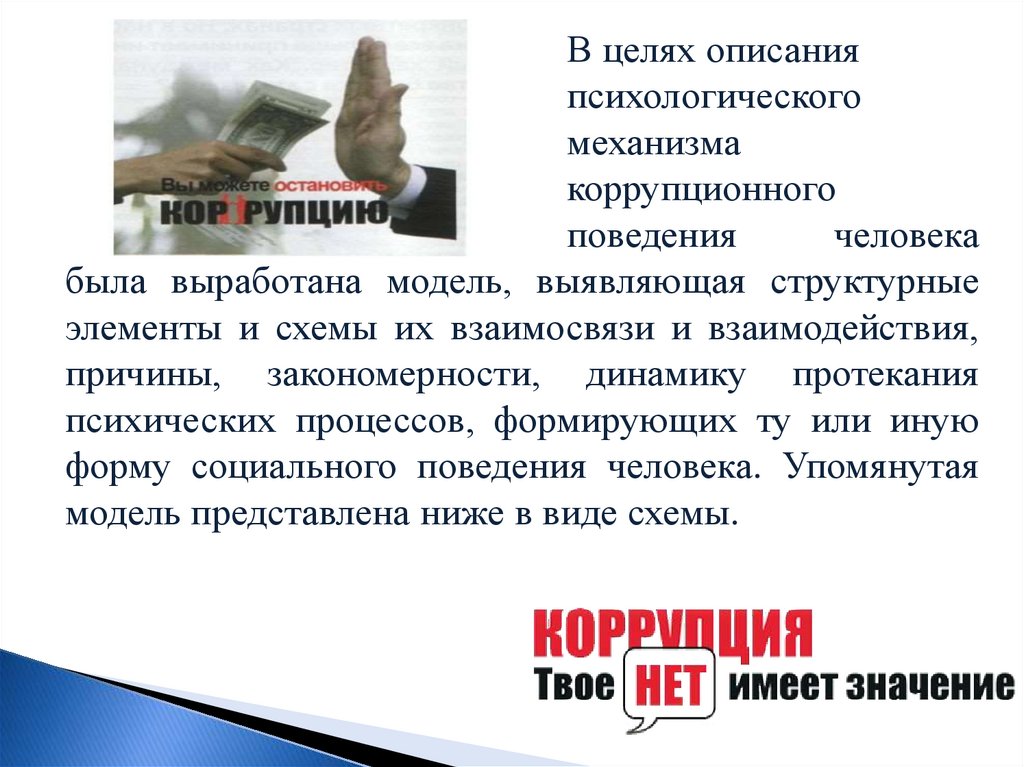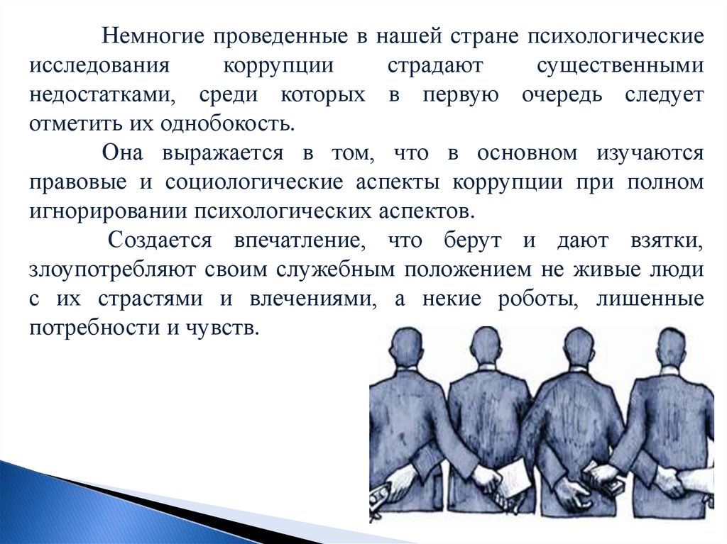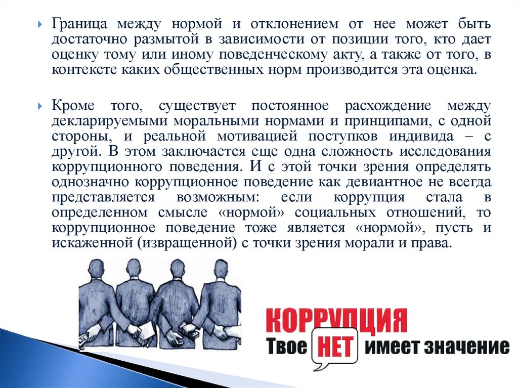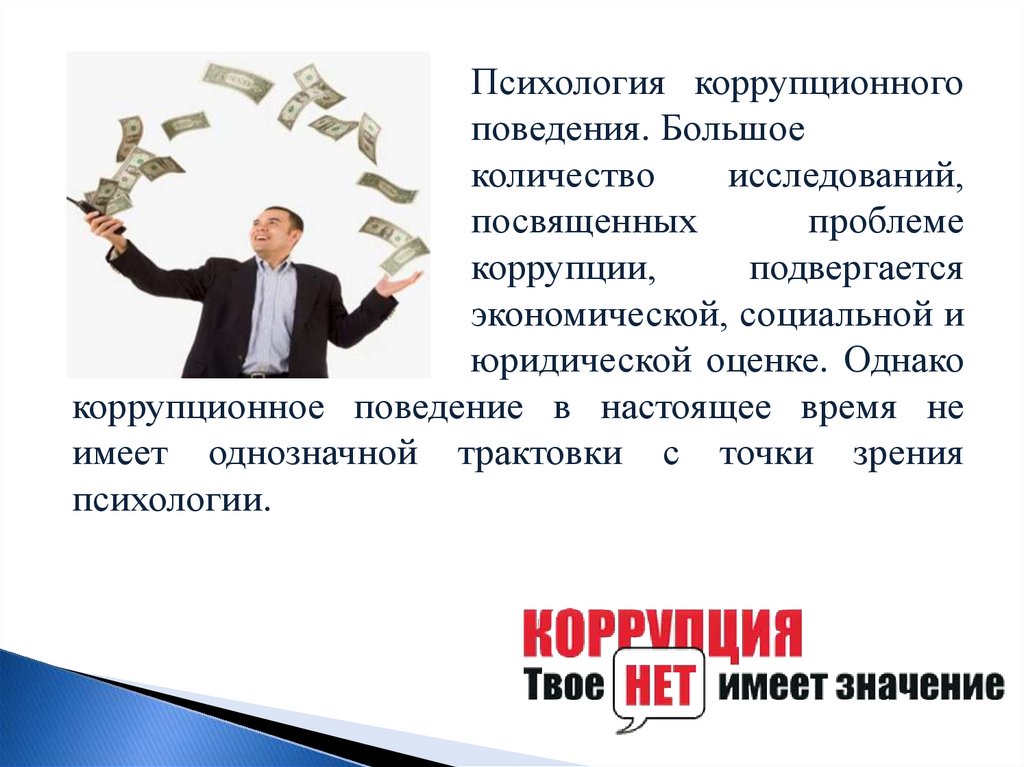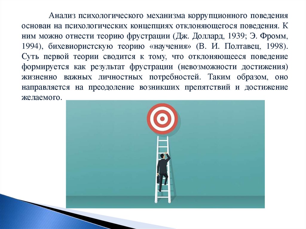 Анализ психологического механизма коррупционного поведенияоснован на психологических концепциях отклоняющегося поведения. К