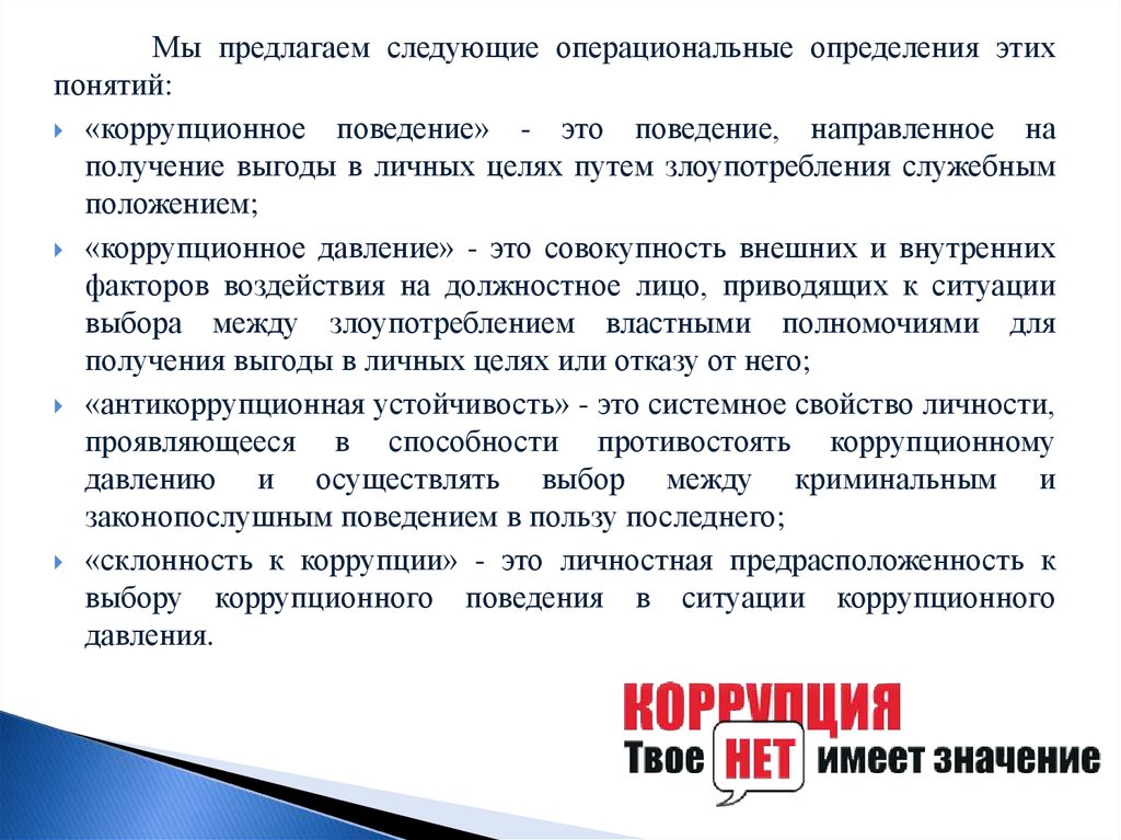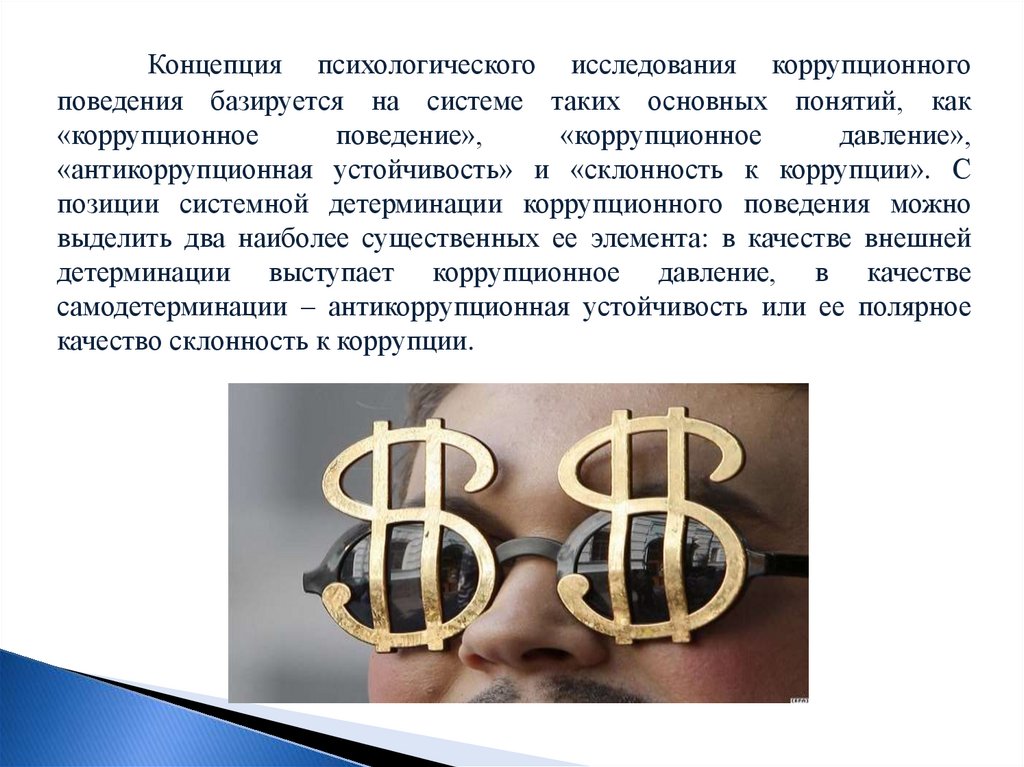 Концепция психологического исследования коррупционногоповедения базируется на системе таких основных понятий, как