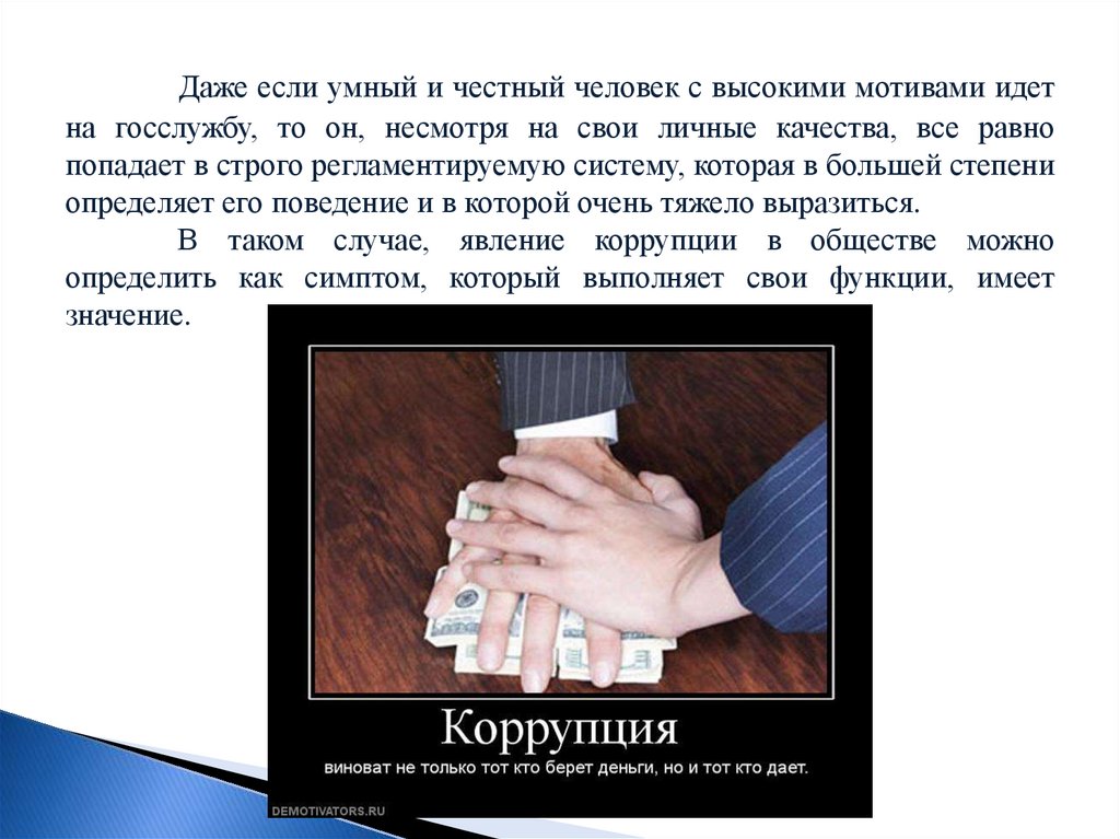 Даже если умный и честный человек с высокими мотивами идетна госслужбу, то он, несмотря на свои личные качества, все равно