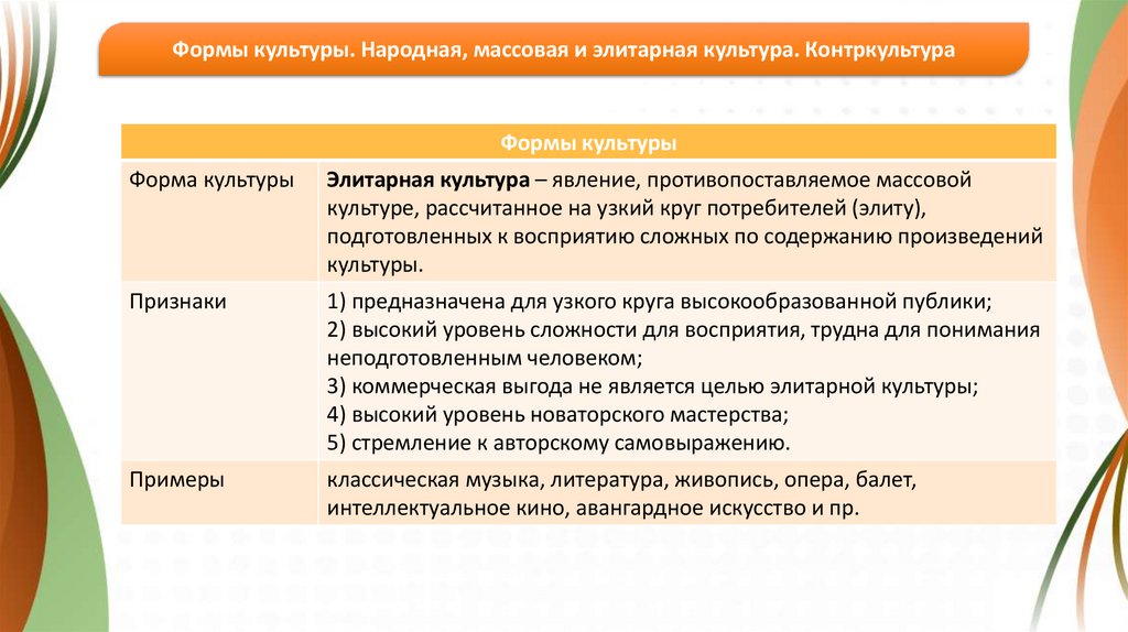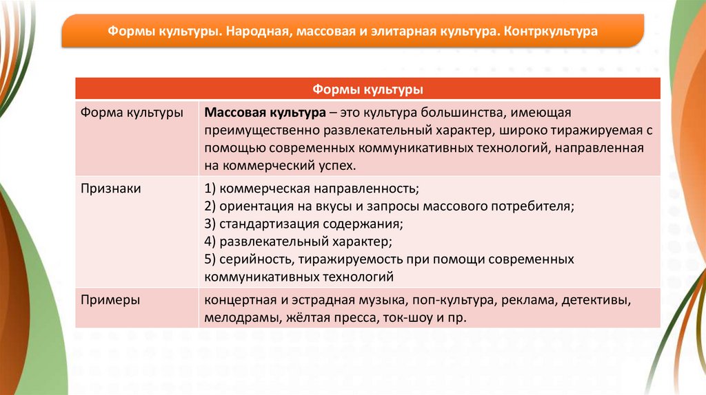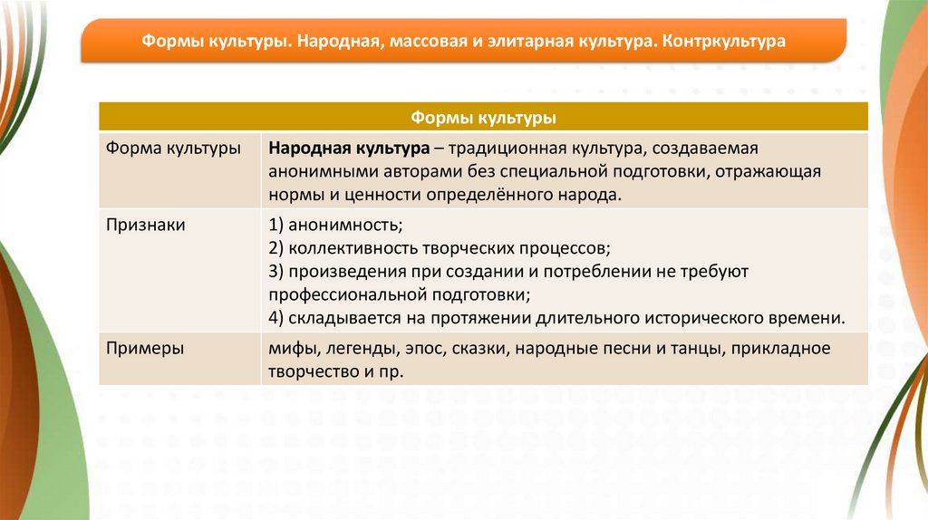 Формы культуры. Народная, массовая и элитарная культура. КонтркультураФормы культуры