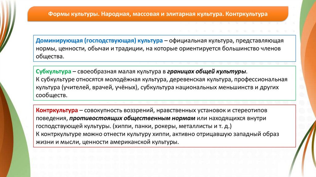 Формы культуры. Народная, массовая и элитарная культура. КонтркультураДоминирующая (господствующая) культура – официальная культура, представляющая