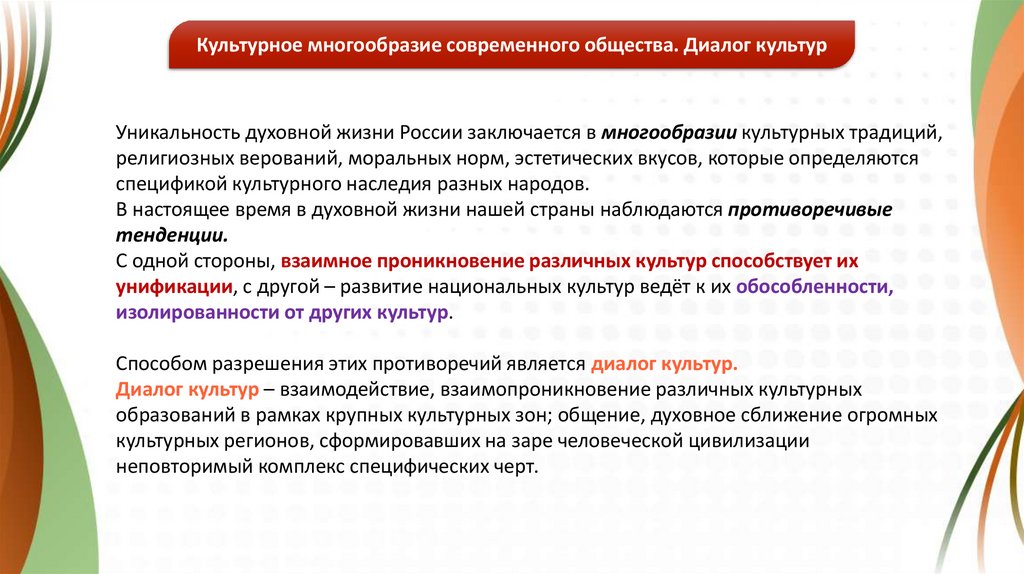 Культурное многообразие современного общества. Диалог культурУникальность духовной жизни России заключается в многообразии культурных традиций,