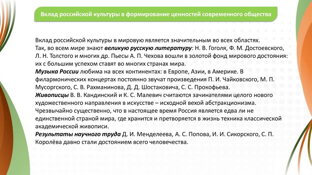 Вклад российской культуры в формирование ценностей современного обществаВклад российской культуры в мировую является значительным во всех областях.