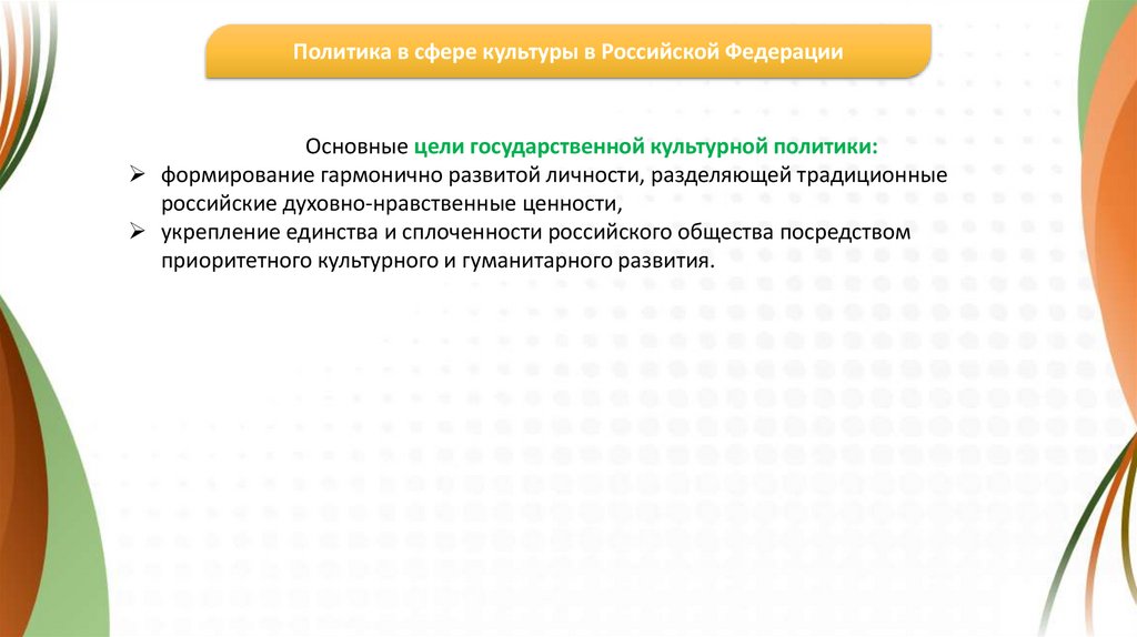 Политика в сфере культуры в Российской ФедерацииОсновные цели государственной культурной политики: