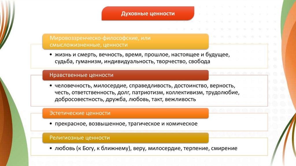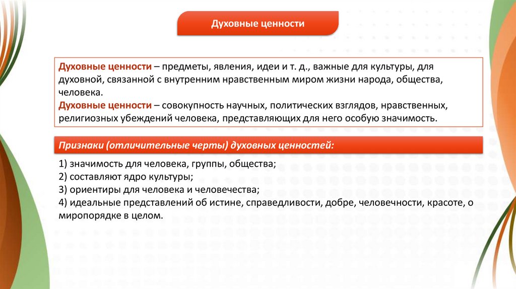Духовные ценностиДуховные ценности – предметы, явления, идеи и т. д., важные для культуры, для