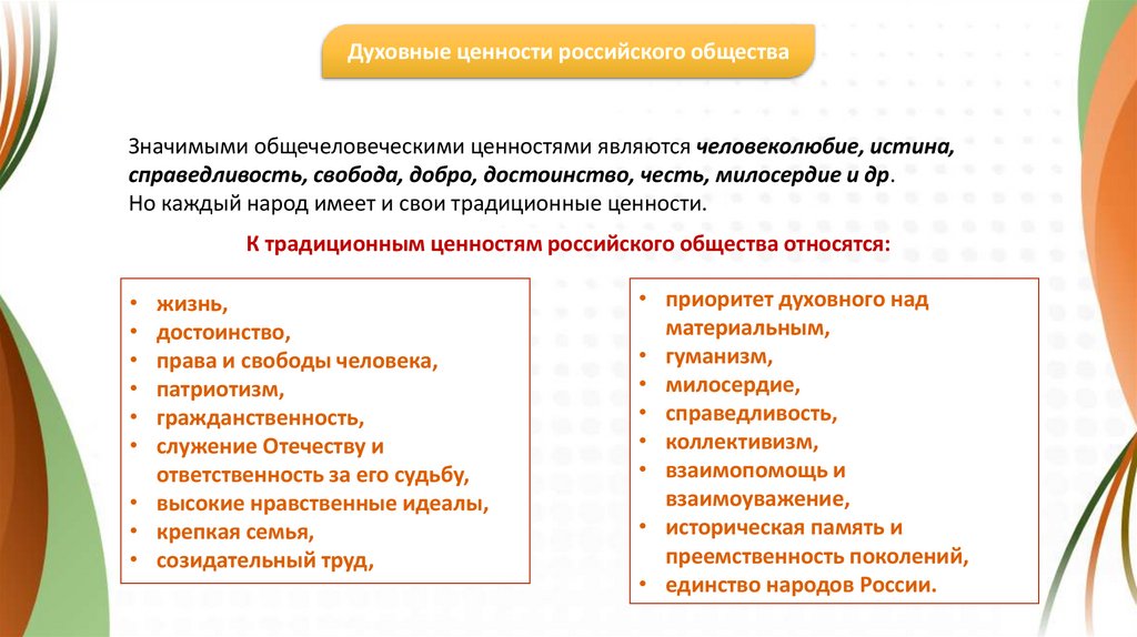 Духовные ценности российского обществаЗначимыми общечеловеческими ценностями являются человеколюбие, истина,