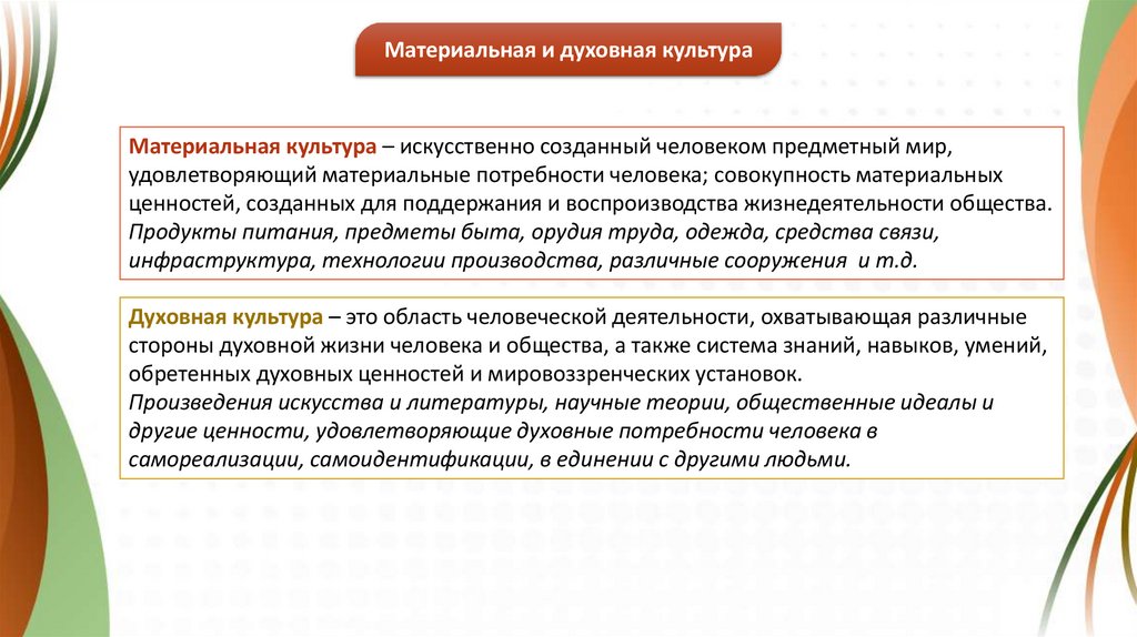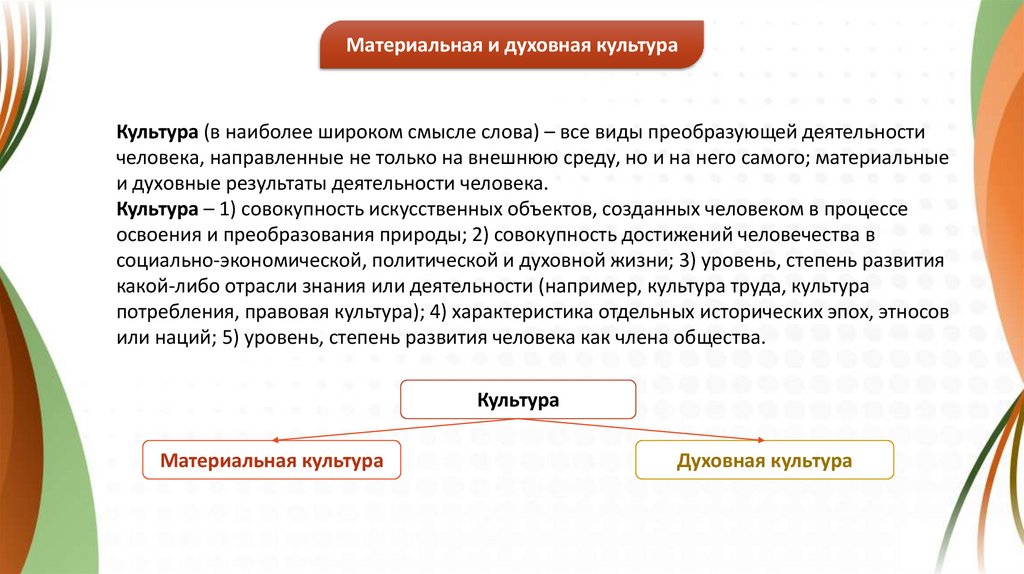 Материальная и духовная культураКультура (в наиболее широком смысле слова) – все виды преобразующей деятельности
