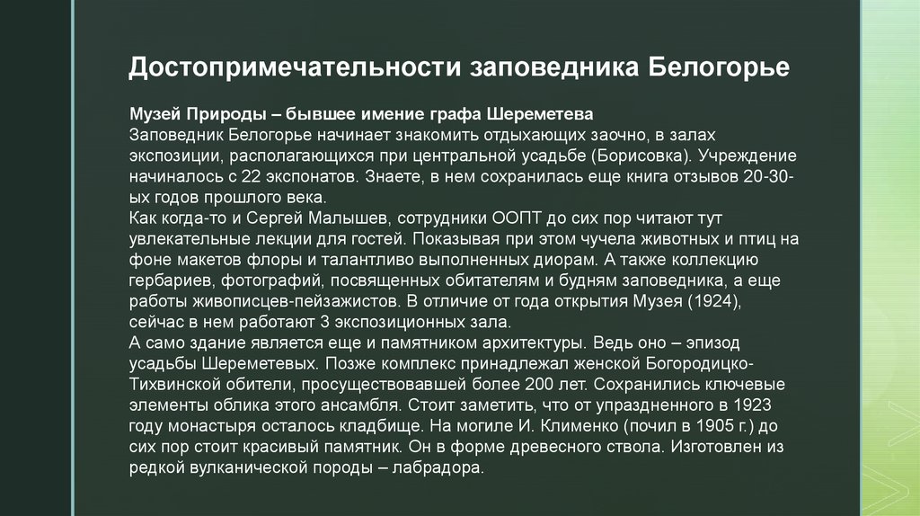 Достопримечательности заповедника БелогорьеМузей Природы – бывшее имение графа Шереметева