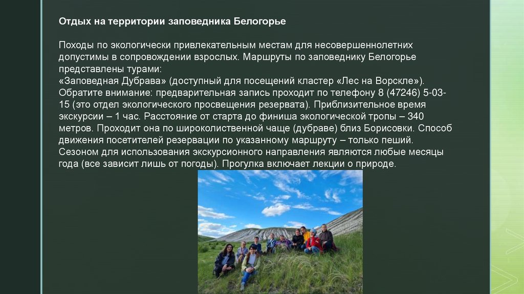Отдых на территории заповедника БелогорьеПоходы по экологически привлекательным местам для несовершеннолетних
