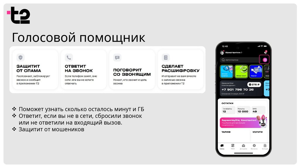 Голосовой помощникПоможет узнать сколько осталось минут и ГБ