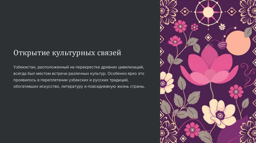 Открытие культурных связейУзбекистан, расположенный на перекрестке древних цивилизаций,