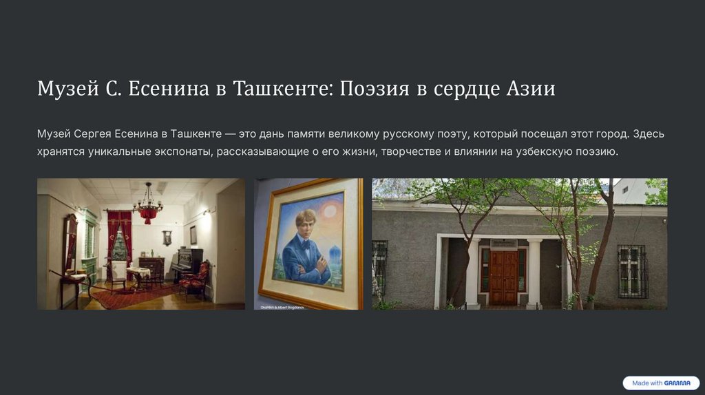 Музей С. Есенина в Ташкенте: Поэзия в сердце АзииМузей Сергея Есенина в Ташкенте — это дань памяти великому русскому поэту, который посещал этот город. Здесь