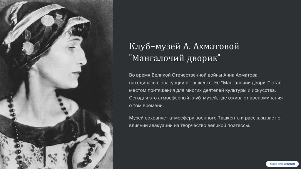 находилась в эвакуации в Ташкенте. Ее "Мангалочий дворик" стал