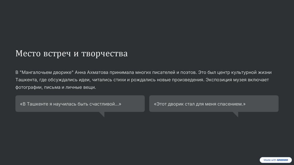 Ташкента, где обсуждались идеи, читались стихи и рождались новые произведения. Экспозиция музея включает