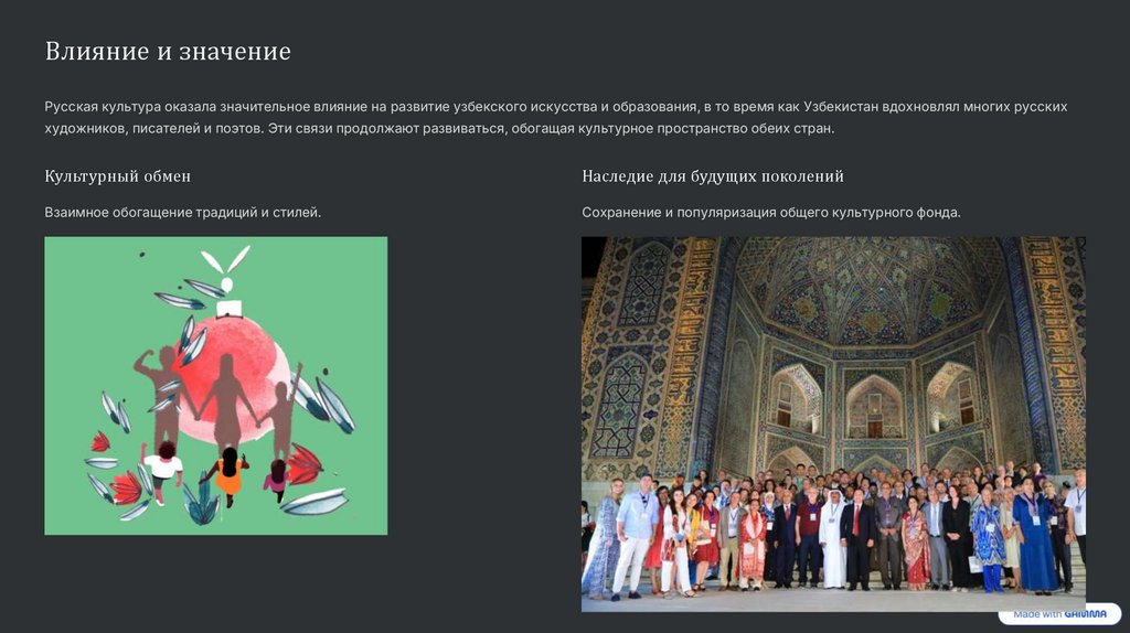 Влияние и значениеРусская культура оказала значительное влияние на развитие узбекского искусства и образования, в то время как Узбекистан вдохновлял многих русских