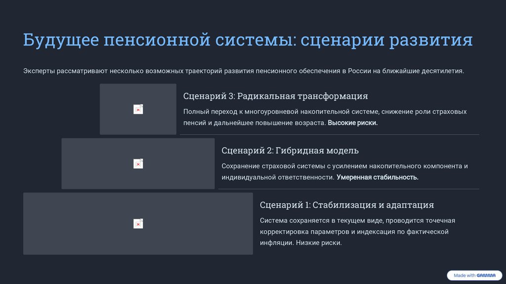 Будущее пенсионной системы: сценарии развитияЭксперты рассматривают несколько возможных траекторий развития пенсионного обеспечения в России на ближайшие десятилетия.