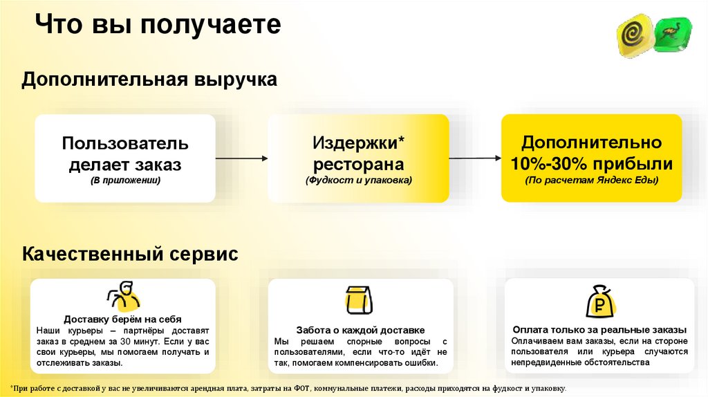 *При работе с доставкой у вас не увеличиваются арендная плата, затраты на ФОТ, коммунальные платежи, расходы приходятся на фудкост и упаковку.