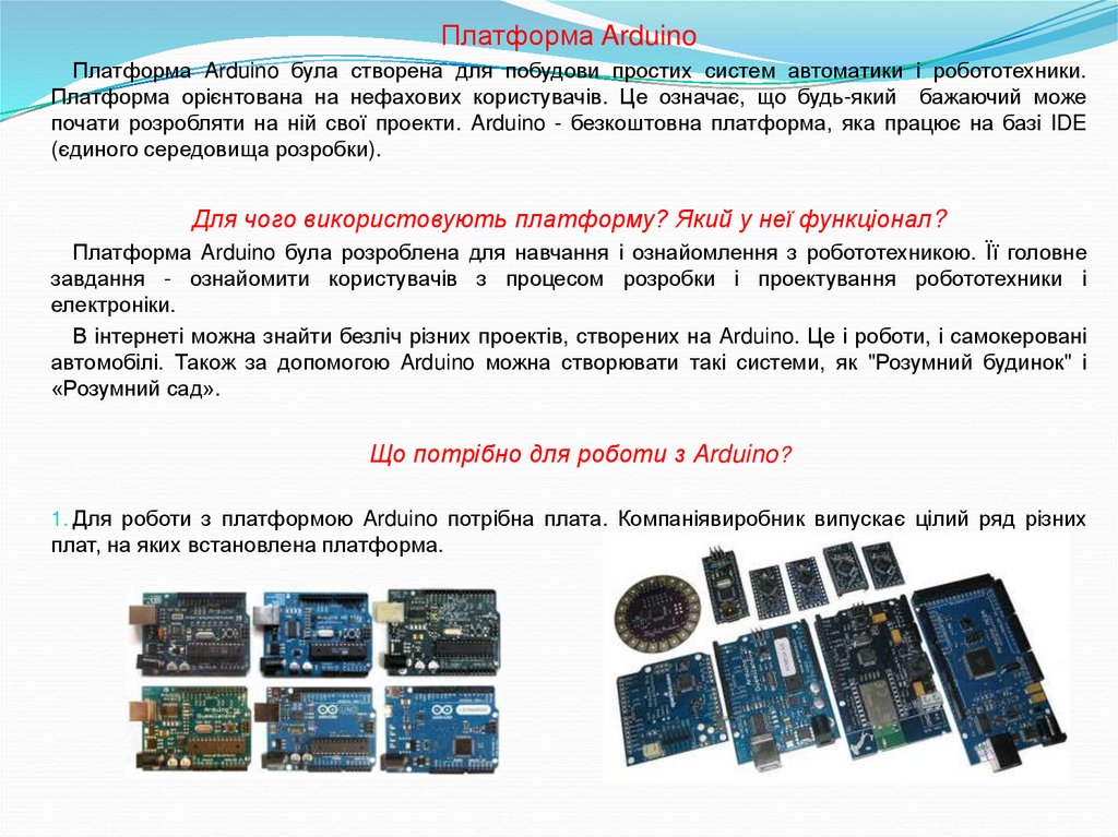 1. Для роботи з платформою Arduino потрібна плата. Компаніявиробник випускає цілий ряд різних