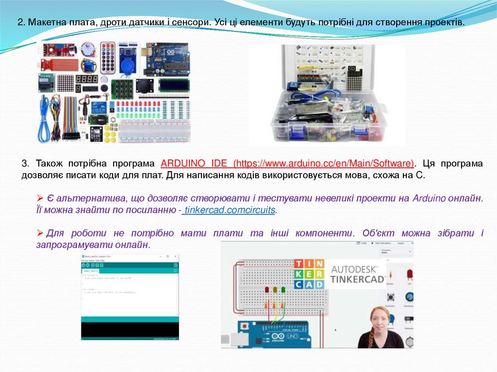 2. Макетна плата, дроти датчики і сенсори. Усі ці елементи будуть потрібні для створення проектів.3. Також потрібна програма ARDUINO IDE (https://www.arduino.cc/en/Main/Software). Ця програма
