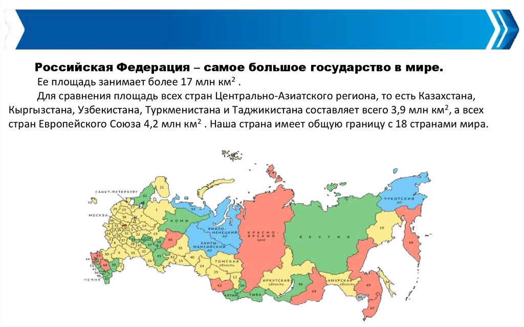 Российская Федерация – самое большое государство в мире.Ее площадь занимает более 17 млн км2 .