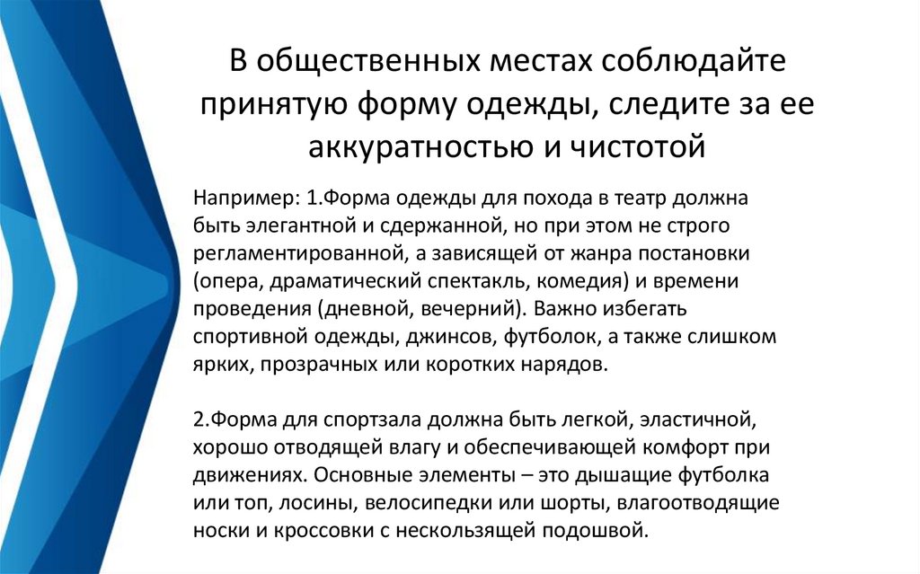 В общественных местах соблюдайтепринятую форму одежды, следите за ее