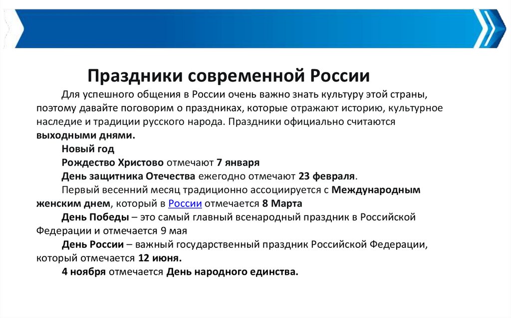 Праздники современной РоссииДля успешного общения в России очень важно знать культуру этой страны,