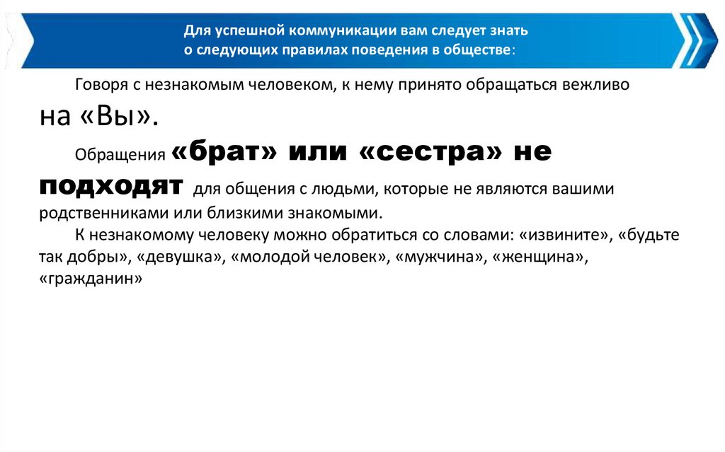 Для успешной коммуникации вам следует знатьо следующих правилах поведения в обществе:
