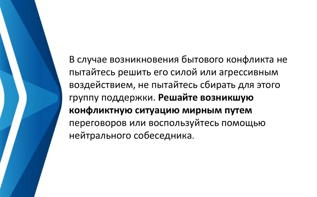 В случае возникновения бытового конфликта непытайтесь решить его силой или агрессивным