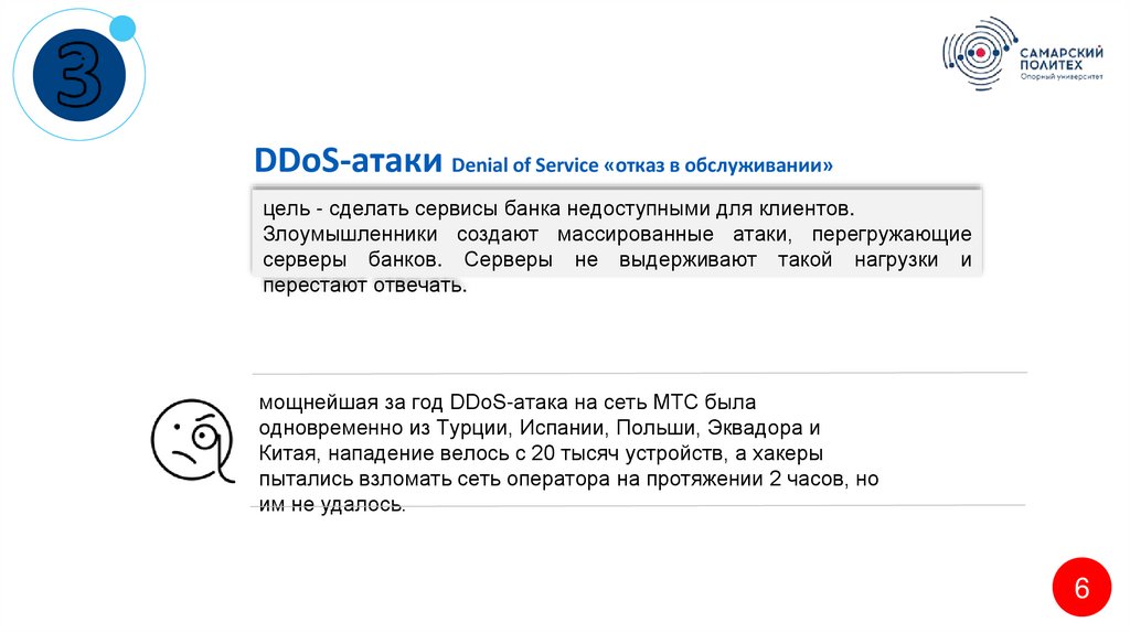 DDoS-атаки Denial of Service «отказ в обслуживании»цель - сделать сервисы банка недоступными для клиентов.